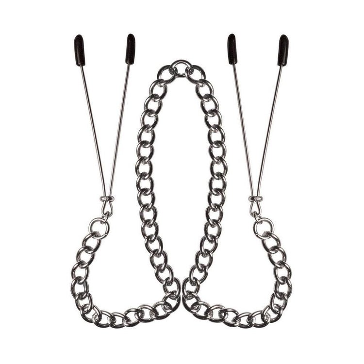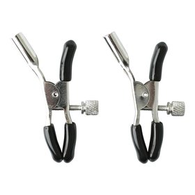 These clamps are mild-moderate pressure. The pressure is fully adjustable based on on how far the small O-ring is pushed toward the ends of the clamp. The chain that hangs from each tweezer clamp can be tugged on while they are being worn to add an extra sensation, and the rubber-covered tips protect sensitive skin from the sharp metal edges of the ends of the clamp.